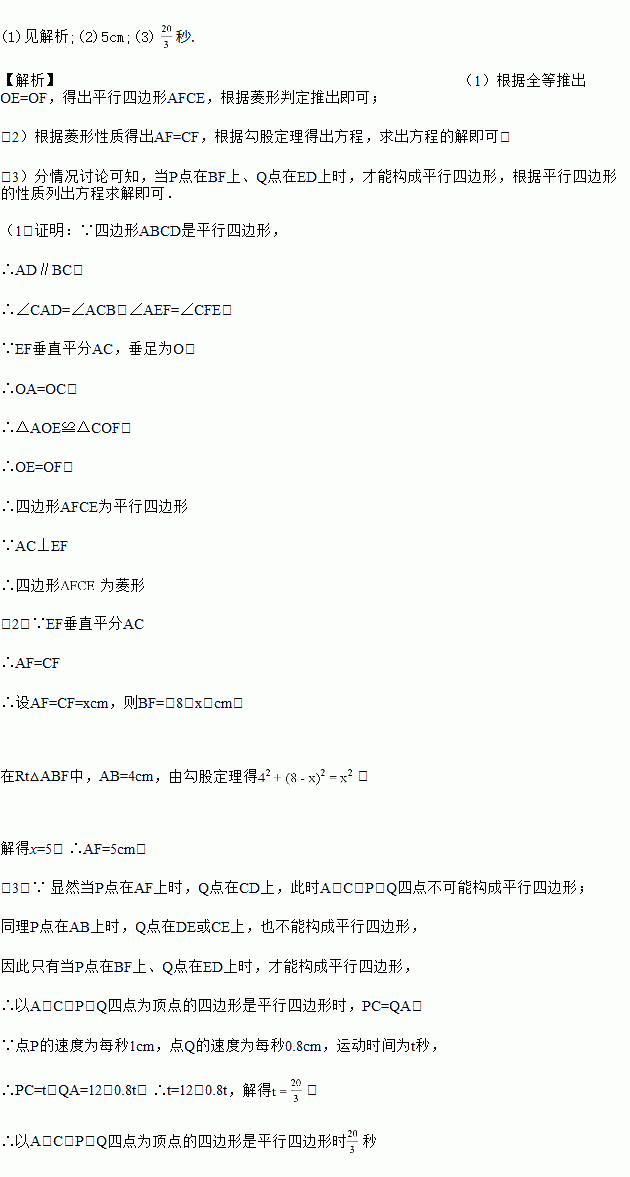 (3)如图2,动点P、Q分别从A、C两点同时出发,沿△AFB和△CDE各边匀速运动一周.即点P自A→F→B→A停止,点Q自C→D→E→C停止.在运动过程中, 点P的速度为每秒1cm,点Q的速度为每秒0.8cm,设运动时间为秒,若当A、P、C、Q四点为顶点的四边形是平行四边形时,求t的值.