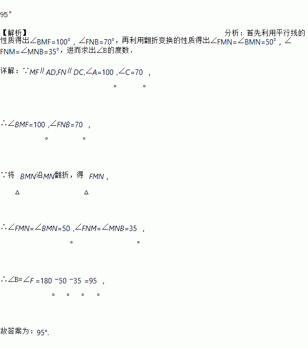 如图,四边形ABCD中,∠A=100°,∠C=70°,点M、N分别在AB、BC上,将△BMN沿MN翻折,得△FMN.若MF∥AD,FN∥DC,则∠B的度数为___.