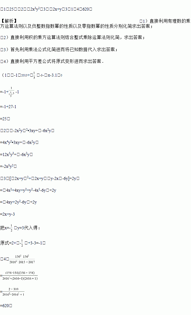 (2)计算:(﹣2x2y)2•3xy÷(﹣6x2y)