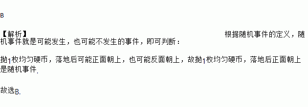 B 【解析】根据随机事件的定义,随机事件就是可能发生,也可能不发生的事件,即可判断: 抛1枚均匀硬币,落地后可能正面朝上,也可能反面朝上,故抛1枚均匀硬币,落地后正面朝上是随机事件. 故选B.