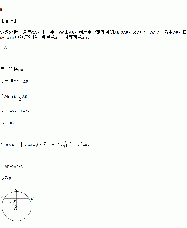 B 【解析】 试题分析:连接OA,由于半径OC⊥AB,利用垂径定理可知AB=2AE,又CE=2,OC=5,易求OE,在Rt△AOE中利用勾股定理易求AE,进而可求AB. 【解析】 连接OA, ∵半径OC⊥AB, ∴AE=BE=AB, ∵OC=5,CE=2, ∴OE=3, 在Rt△AOE中,AE===4, ∴AB=2AE=8, 故选B. ...