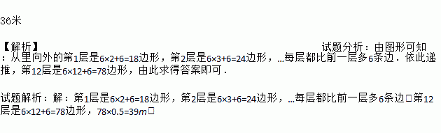 一个广场地面的一部分如图所示,地面的中央是一块正六边形的地砖, 周围用正三角形和正方形的大理石地砖拼成,从里往外共12层(不包括中央的正六边形地砖),每一层的外界都围成一个多边形.若中央正六边形地砖的边长是0.5米, 则第12层的外边界所围成的多边形的周长是多少?