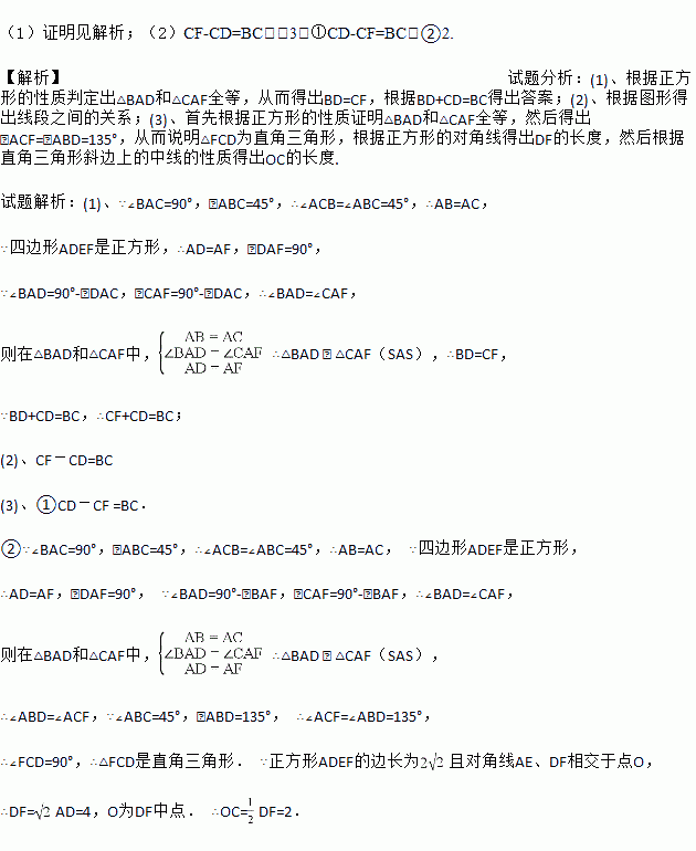 (2)如图2,当点D在线段BC的延长线上时,其他条件不变,请直接写出CF,BC,CD三条线段之间的关系;