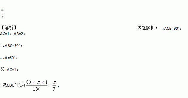 如图,在△ABC中,∠ACB=90°,AC=1,AB=2,以点A为圆心、AC的长为半径画弧,交AB边于点D,则弧CD的长等于________.(结果保留π)