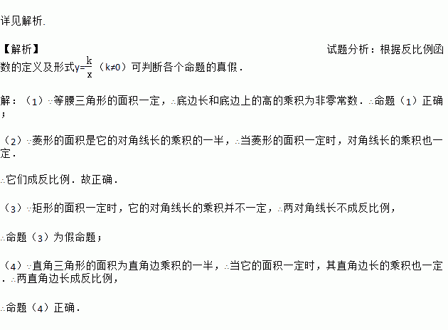 给出下列四个关于是否成反比例的命题,判断它们的真假.