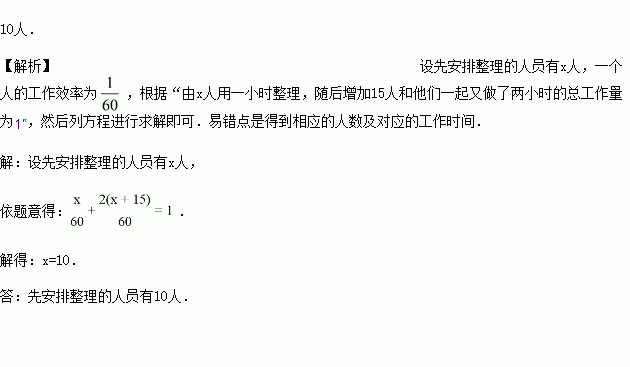 整理一批图书,如果由一个人单独做要花60小时.现先由一部分人用1小时整理,随后增加15人和他们一起又做了2小时,恰好完成整理工作.假设每个人的工作效率相同,那么先安排整理的人员有多少人?