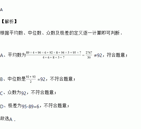 A. 平均数是92 B. 中位数是92 C. 众数是92 D. 极差是6