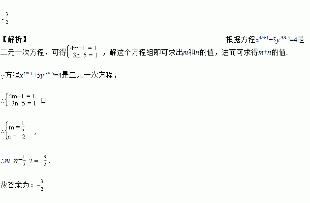 若方程x4m-1+5y-3n-5=4是二元一次方程,则m+n=_________.