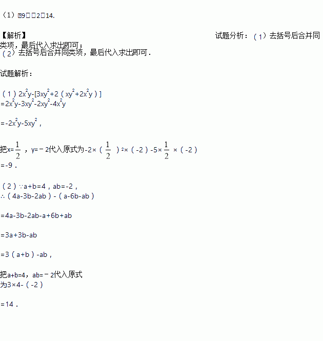 (1)2x2y﹣[3xy2+2(xy2+2x2y)],其中x=,y=﹣2.