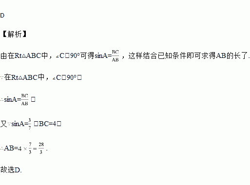 在Rt△ABC中,∠C=90°,sinA=,BC=4,则AB的长为( )