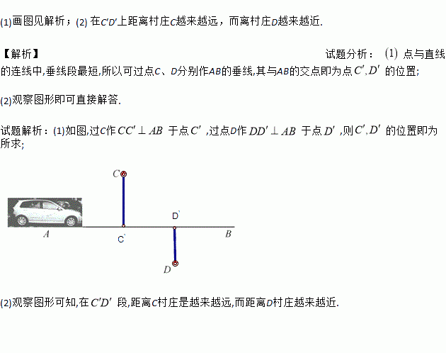 (1)该汽车行驶到公路AB上的某一位置C′时距离村庄C最近,行驶到D′位置时,距离村庄D最近,请在公路AB上作出C′,D′的位置(保留作图痕迹);