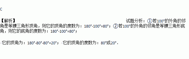 已知等腰三角形的一个外角等于100°,则它的顶角是( )