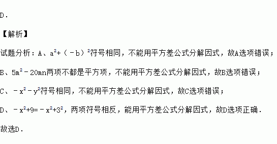 A.a2+(﹣b)2 B.5m2﹣20mn C.﹣x2﹣y2 D.﹣x2+9