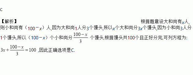 我国明代珠算家程大位的名著《直指算法统宗》里有一道著名算题:“一百馒头一百僧,大僧三个更无争,小僧三人分一个,大小和尚各几丁?”意思是:有100个和尚分100个馒头,如果大和尚1人分3个,小和尚3人分1个,正好分完,试问大、小和尚各多少人?设大和尚有x人,依题意列方程得( )