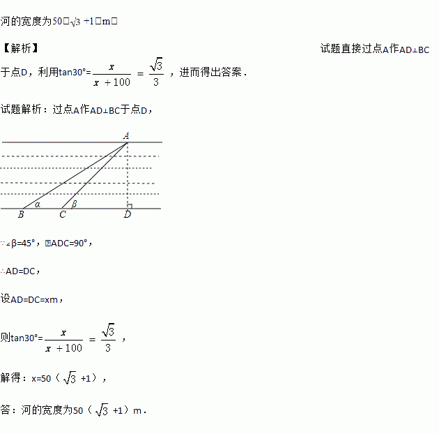 (2017四川宜宾第21题)如图,为了测量某条河的宽度,现在河边的一岸边任意取一点A,又在河的另一岸边去两点B、C测得∠α=30°,∠β=45°,量得BC长为100米.求河的宽度(结果保留根号).