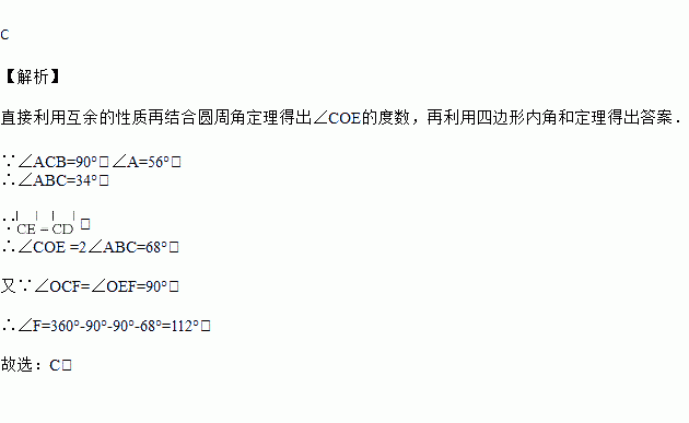 如图,在Rt△ABC中,∠ACB=90°,∠A=56°.以BC为直径的⊙O交AB于点D.E是⊙O上一点,且