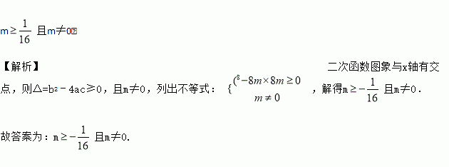 m且m≠0. 【解析】二次函数图象与x轴有交点,则△=b2﹣4ac≥0,且m≠0,列出不等式: ,解得m且m≠0. 故答案为:m且m≠0.