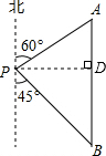 分析:过P作PD⊥AB,垂足为D,则三角形PDB是等腰直角三角形,则PD和BD的长度即可求解,然后在直角△APD中,利用勾股定理可求得AD的长,根据AB=AD+BD即可求解.