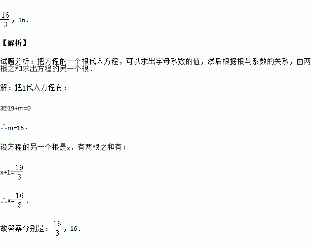 ,16. 【解析】 试题分析:把方程的一个根代入方程,可以求出字母系数的值,然后根据根与系数的关系,由两根之和求出方程的另一个根. 【解析】 把1代入方程有: 3﹣19+m=0 ∴m=16. 设方程的另一个根是x,有两根之和有: x+1= ∴x=. 故答案分别是:,16.
