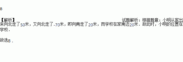 小明的家,学校和书店依次坐落在一条南北方向的大街上,学校在家南边20米,书店在家北边100米,小明从家出来向北走了50米,又向北走了﹣70米,此时,小明的位置在( )