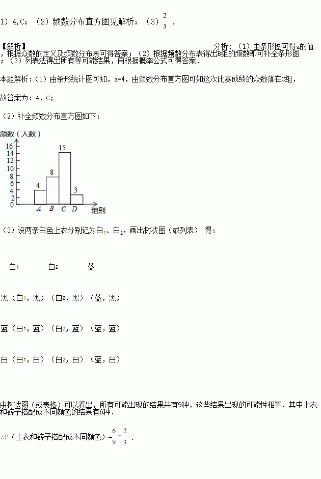 (3)学校决定选派本次比赛成绩最好的3人参加全市中学生朗诵比赛,并为参赛选手准备了2件白色、1件蓝色上衣和黑色、蓝色、白色的裤子各1条,小军先选,他从中随机选取一件上衣和一条裤子搭配成一套衣服,请用画树状图法或列表法求出上衣和裤子搭配成不同颜色的概率.