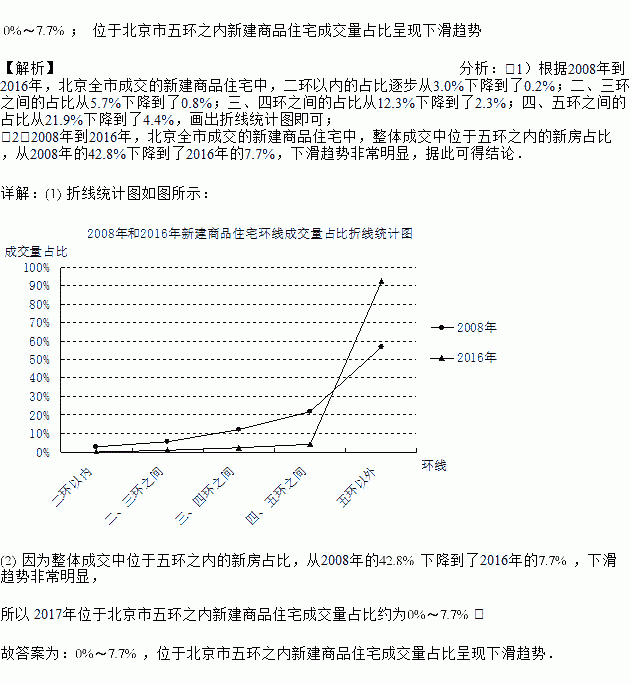 根据材料提供的信息,预估 2017年位于北京市五环之内新建商品住宅成交量占比约______ ,你的预估理由是______ .![]()