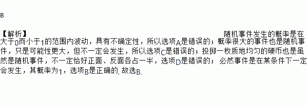B 【解析】随机事件发生的概率是在大于0而小于1的范围内波动,具有不确定性,所以选项A是错误的;概率很大的事件也是随机事件,只是可能性更大,但不一定会发生,所以选项C是错误的;投掷一枚质地均匀的硬币也是虽然是随机事件,不一定恰好正面、反面各占一半,选项D是错误的; 必然事件是在某条件下一定会发生,其概率为1,选项B是正确的. 故选B.