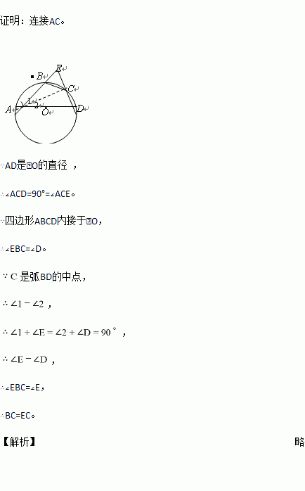如图10,四边形ABCD内接于⊙O,并且AD是⊙O的直径,C是弧BD的中点,AB和DC的延长线交⊙O外一点E.求证:BC=EC.