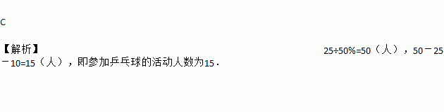 C 【解析】25÷50%=50(人),50-25-10=15(人),即参加乒乓球的活动人数为15.