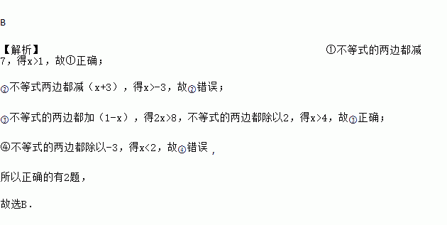 小明的作业本上有四道利用不等式的性质,将不等式化为x>a或x<a的作业题:①由x+7>8解得x>1;②由x<2x+3解得x<3;③由3x-1>x+7解得x>4;④由-3x>-6解得x<-2.其中正确的有( )