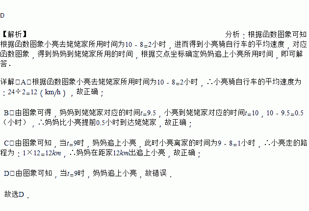 小亮家与姥姥家相距24km. 小亮8:00从家出发,骑自行车去姥姥家,妈妈8:30从家出发,乘车沿相同路线去姥姥家. 在同一直角坐标系中,小亮和妈妈的行进路程S(km)与北京时间t(时)的函数图象如图所示. 根据图象得到下列结论,其中错误的是( )