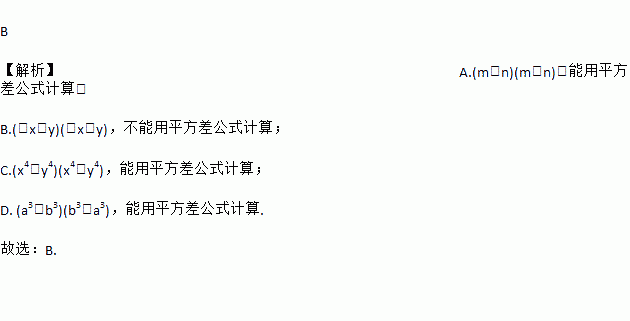 B 【解析】A.(m-n)(m+n),能用平方差公式计算; B.(-x-y)(-x-y),不能用平方差公式计算; C.(x4-y4)(x4+y4),能用平方差公式计算; D. (a3-b3)(b3+a3),能用平方差公式计算. 故选:B.