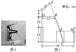 小明家的洗手盆上装有一种抬启式水龙头(如图1),完全开启后,水流路线呈抛物线,把手端点A,出水口B和落水点C恰好在同一直线上,点A至出水管BD的距离为12cm,洗手盆及水龙头的相关数据如图2所示,现用高10.2cm的圆柱型水杯去接水,若水流所在抛物线经过点D和杯子上底面中心E,则点E到洗手盆内侧的距离EH为 cm.
