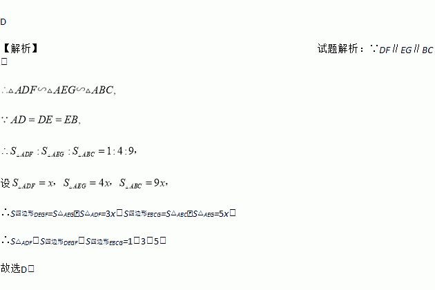 D 【解析】试题解析:∵DF∥EG∥BC, 设 ∴S四边形DEGF=S△AEG﹣S△ADF=3x,S四边形EBCG=S△ABC﹣S△AEG=5x, ∴S△ADF:S四边形DEGF:S四边形EBCG=1:3:5, 故选D.