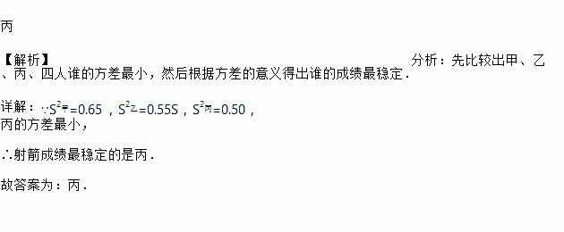 甲、乙、丙三人进行射箭测试,每人10次射箭成绩的平均数都是8.9环,方差分别是=0.65,=0.55,=0.50,则射箭成绩最稳定的是______________.