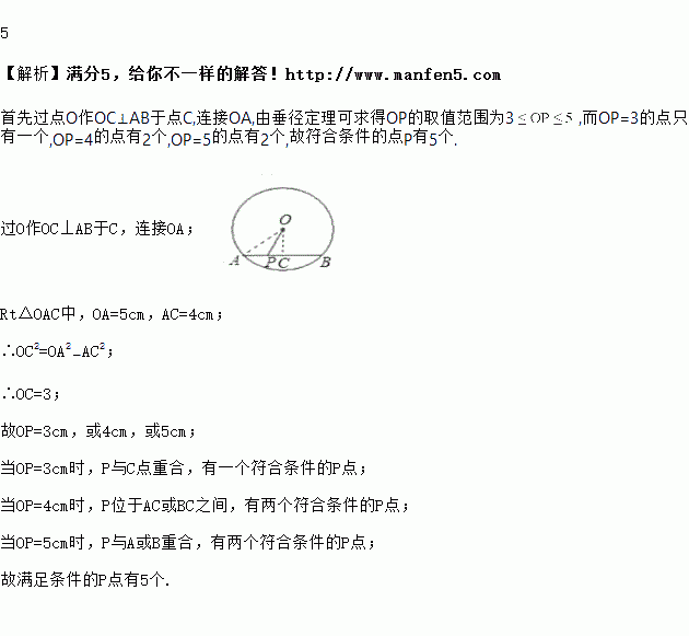 如图,⊙O的半径为5cm,弦AB为8cm,P为弦AB上的一动点,若OP的长度为整数,则满足条件的点P有____个.