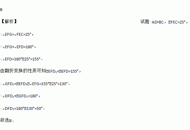 如图,矩形纸片ABCD沿EF折叠后,∠FEC=25°,则∠DFD1的度数为( )
