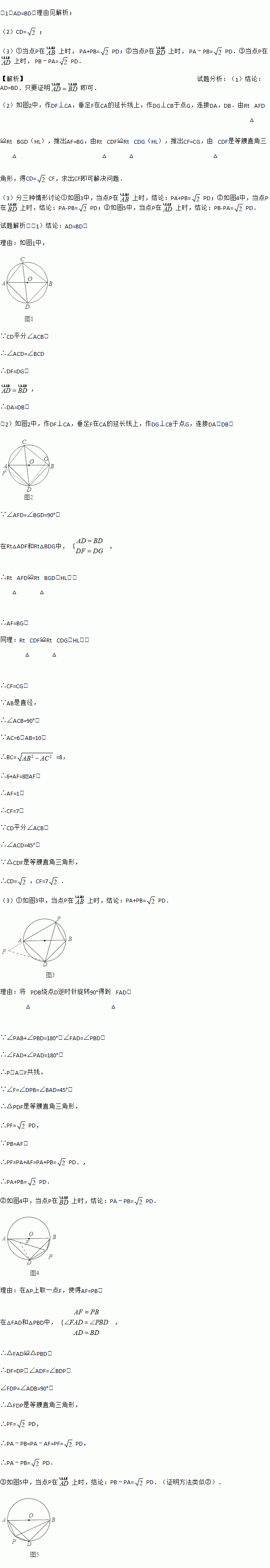 (3)若P为⊙O上异于A、B、C、D的点,试探究PA、PD、PB之间的数量关系.