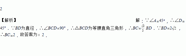 如图,⊙O是△ABC的外接圆,∠A=45°,BD为⊙O的直径,BD=2,则BC=__________.