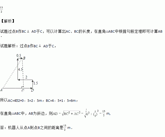 中国机器人创意大赛于2014年7月15日在哈尔滨开幕.如图是一参赛队员设计的机器人比赛时行走的路径,机器人从A处先往东走4m,又往北走1.5m,遇到障碍后又往西走2m,再转向北走4.5m处往东一拐,仅走0.5m就到达了B.问机器人从点A到点B之间的距离是多少?