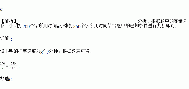 小明和小张两人练习电脑打字,小明每分钟比小张少打10个字,小明打200个字所用的时间和小张打250个字所用的时间相等.设小明打字速度为x个/分钟,则列方程正确的是( )