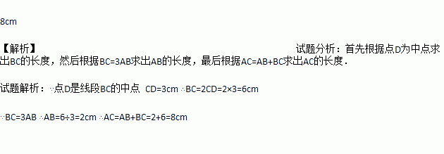 如图,延长线段AB到C,使BC=3AB,点D是线段BC的中点,如果CD=3cm,那么线段AC的长度是多少?