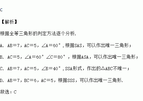 C. AB=7,AC=5,∠B=40° D. AB=7,BC=6,AC=5