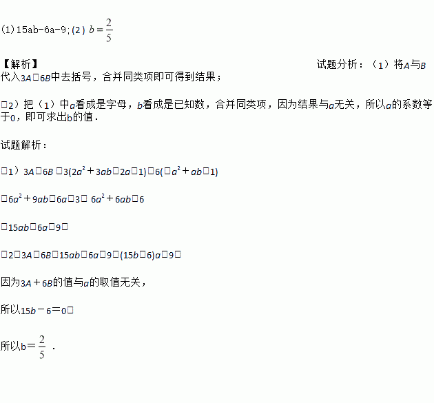(1)15ab-6a-9;(2 ) 【解析】试题分析:(1)将A与B代入3A+6B中去括号,合并同类项即可得到结果; (2)把(1)中a看成是字母,b看成是已知数,合并同类项,因为结果与a无关,所以a的系数等于0,即可求出b的值. 试题解析: (1)3A+6B =3(2a2+3ab-2a-1)+6(-a2+ab-1) =6a2+9ab-6a-3- 6a2+6ab-6 ...