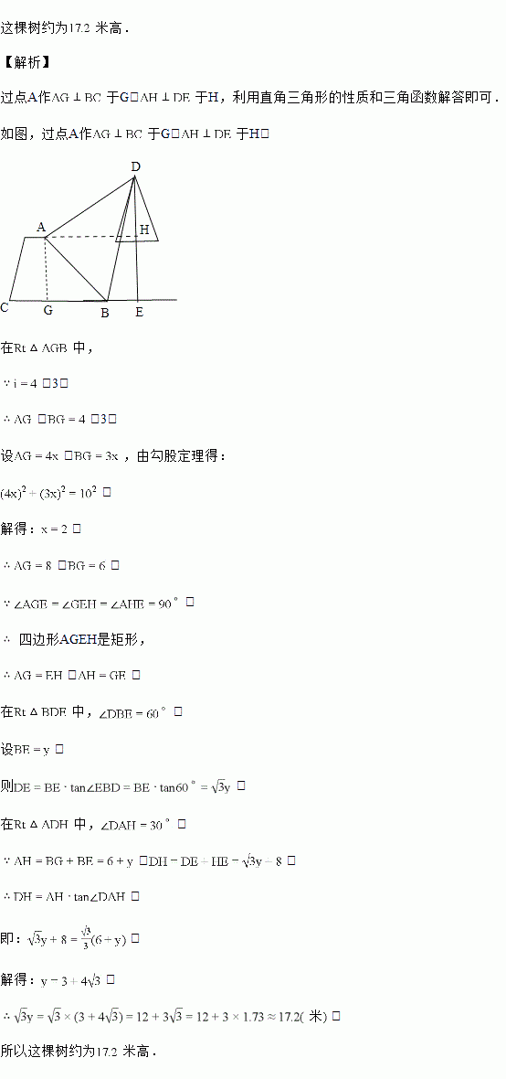如图所示,已知背水坡AB的坡度:3,AB的长为10米,请你帮助小亮算一算这颗大树的高度![]()