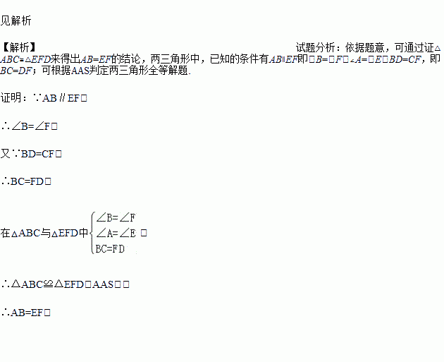 如图,点D,C在BF上,AB∥EF,∠A=∠E,BD=CF.求证:AB=EF.