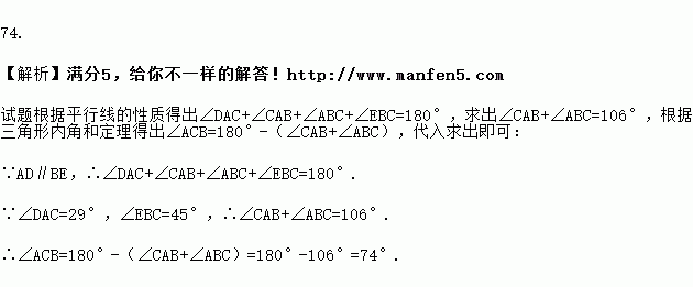 如图,已知AD∥BE,∠DAC=29°,∠EBC=45°,则∠ACB= °.