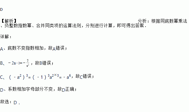 A. a2•a3=a6 B. ﹣2a﹣2=﹣