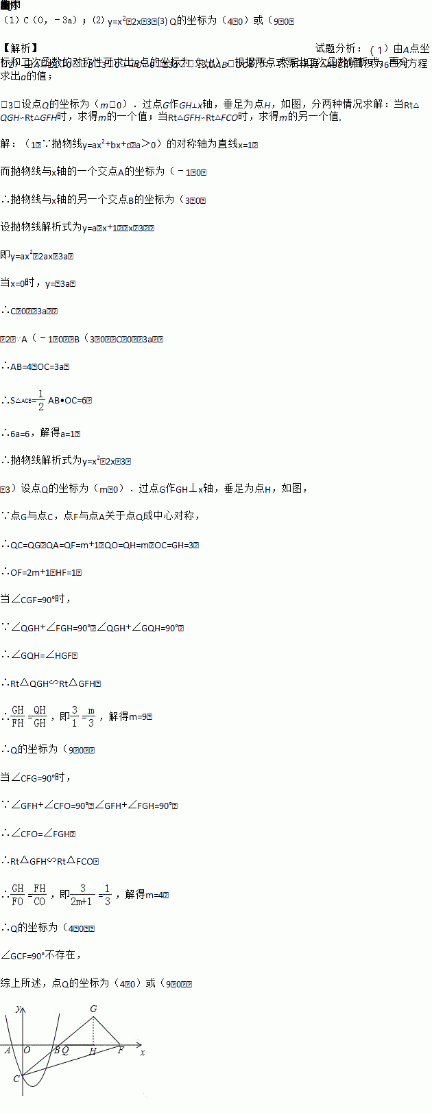 (3)在第(2)小题的条件下,点Q为x轴正半轴上一点,点G与点C,点F与点A关于点Q成中心对称,当△CGF为直角三角形时,求点Q的坐标.