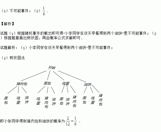 (2)请用列表或树状图的方法,求出小张同学该天早餐刚好得到猪肉包和油饼的概率.